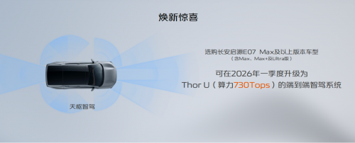 值得一提的是,品牌方還為消費者帶來“煥新驚喜”。基于長安汽車全棧自研的SDA天樞架構所具備的“硬件可插拔”能力,長安啟源E07 Max及以上版本車型(含Max、Max+及Ultra版),預計將在2026年一季度升級搭載高算力Thor U(算力730Tops)的端到端智駕輔助系統,讓用戶暢享更智能、更安全的城區智駕體驗。